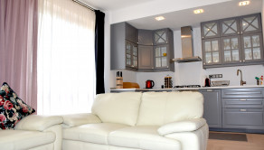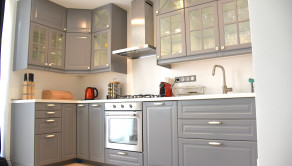 Byt je kompletne zariadený vrátane všetkých spotrebičov (plynový sporák, elektrická rúra, umývačka riadu, chladnička s mrazničkou).