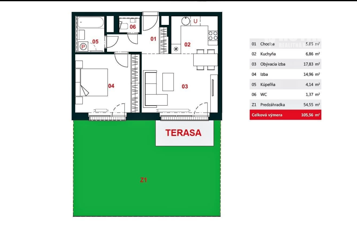 Celková výmera: 108,8 m2, z toho byt 51 m2, sklad 3,8 m2, predzáhradka s terasou 54 m2.