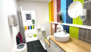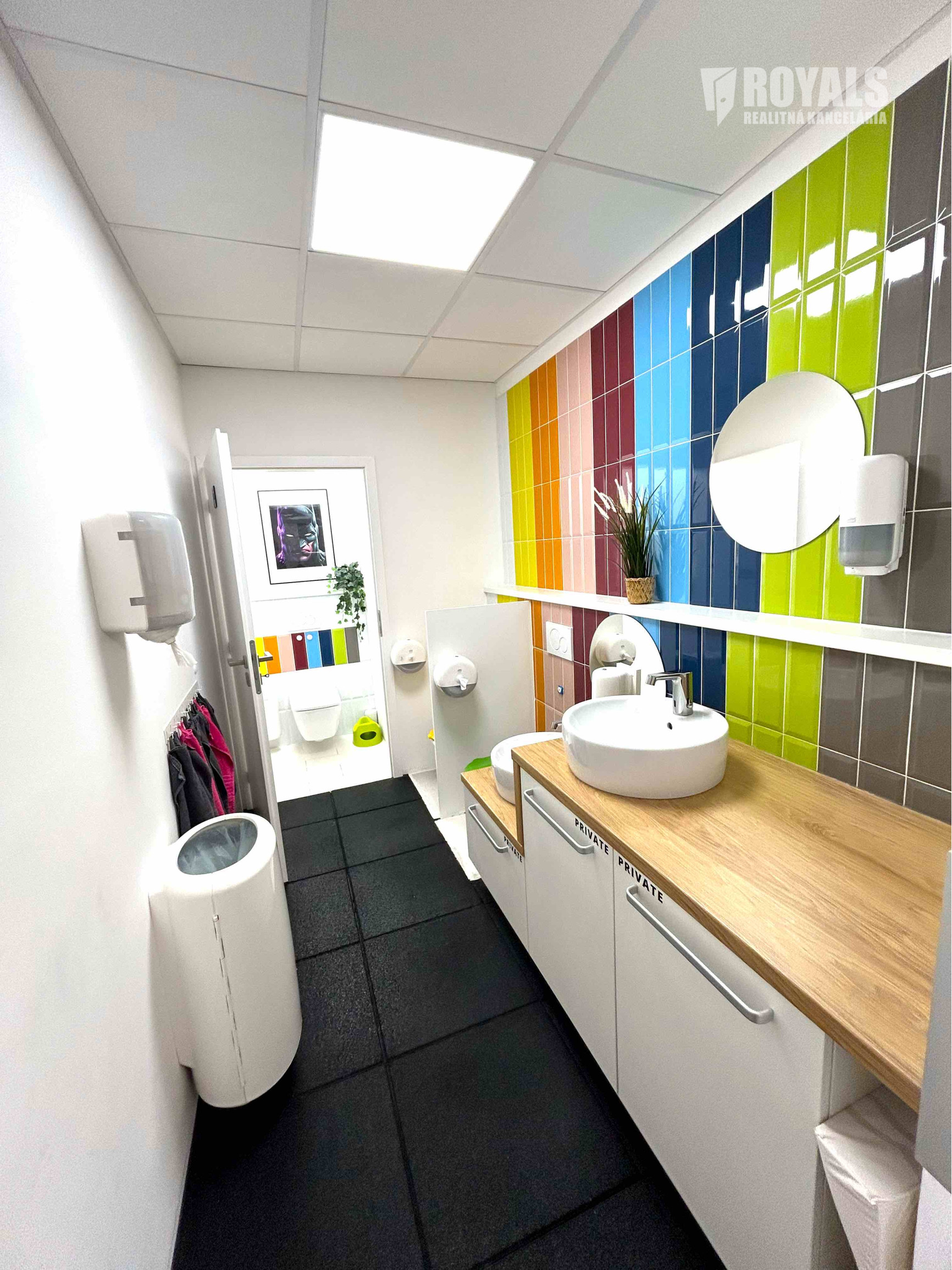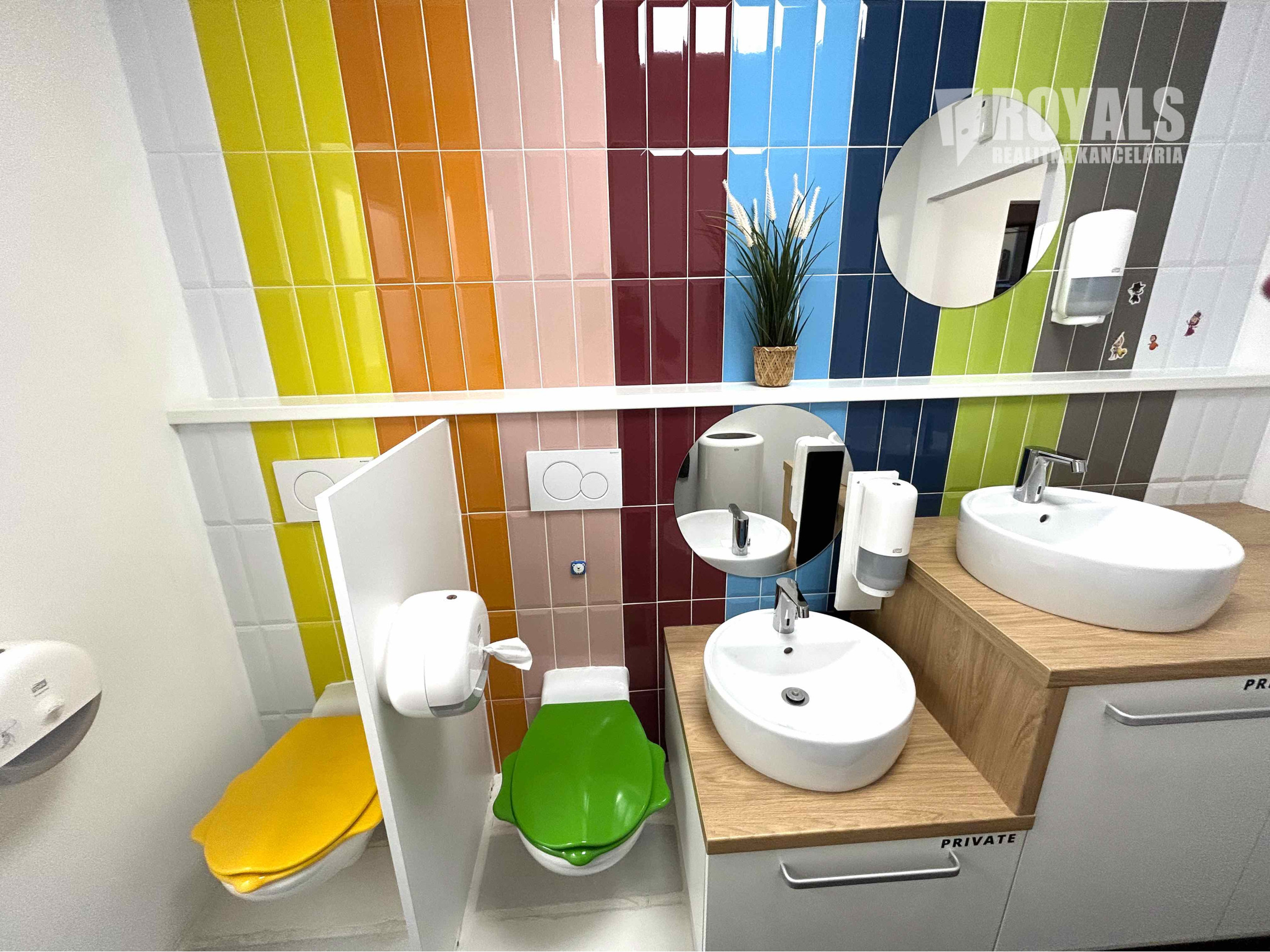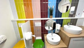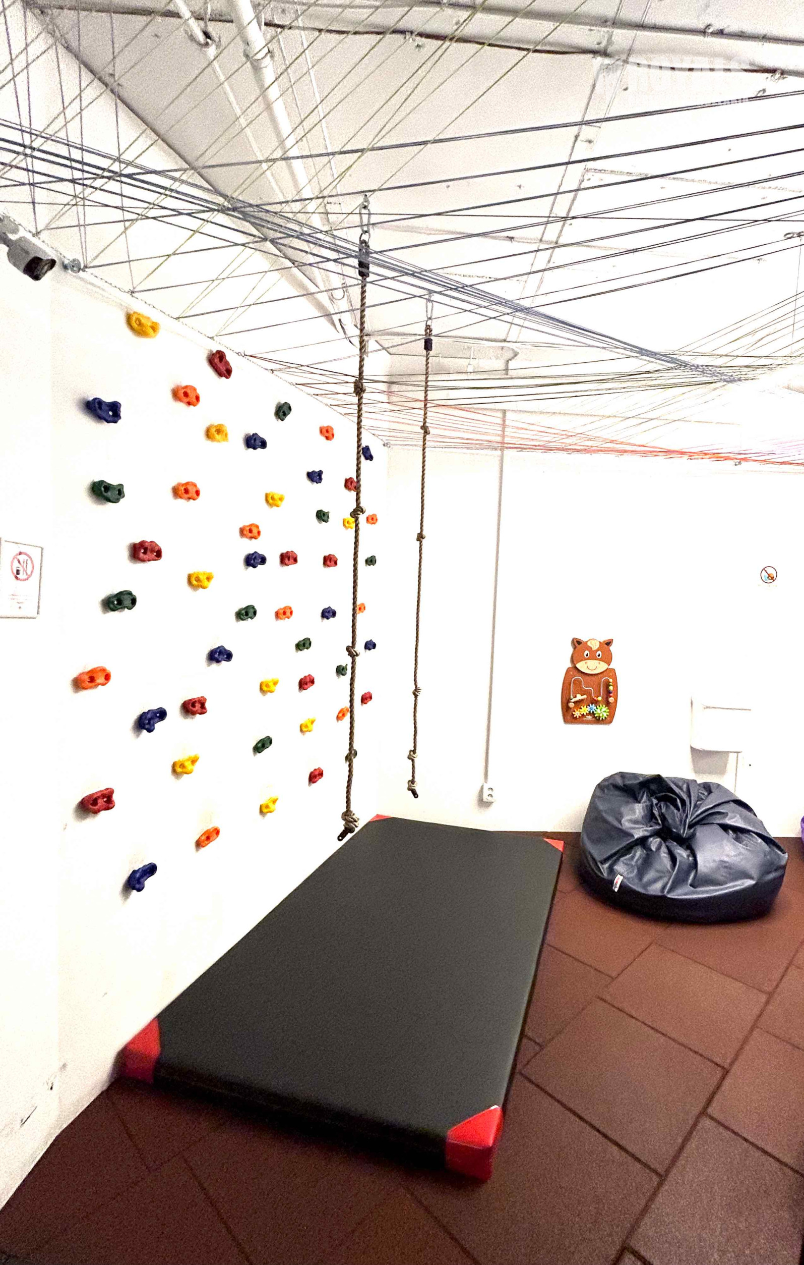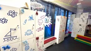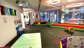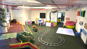 Dispozícia: herňa s interaktívnou zónou, relaxačný kútik, samostatná kancelária, plne vybavená kuchynka s kaviarenským kútikom a knižnicou, sociálne zázemie a toalety prispôsobené pre deti i dospelých.