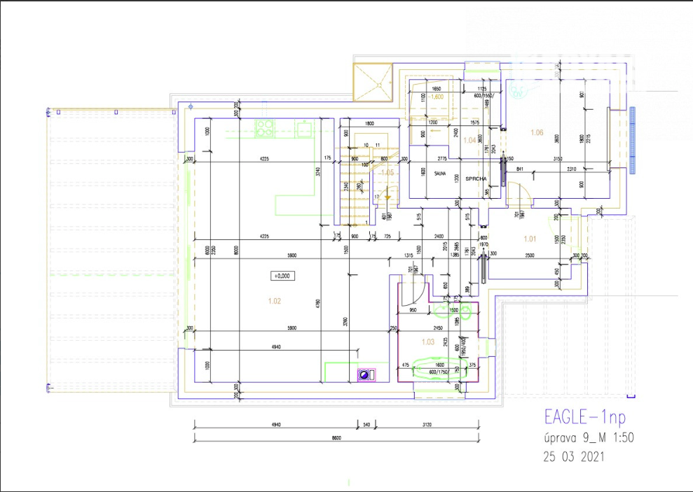 1.NP – predsieň, príručná garáž na golfový vozík, kúpeľňa, predpríprava na saunu, obývačka spojená s kuchyňou, terasa (prestrešená s predprípravou na ohrievače).